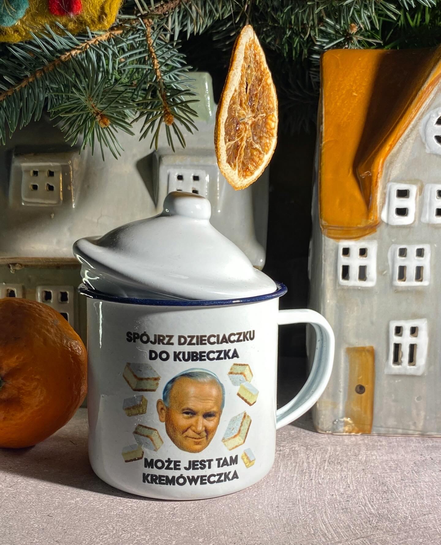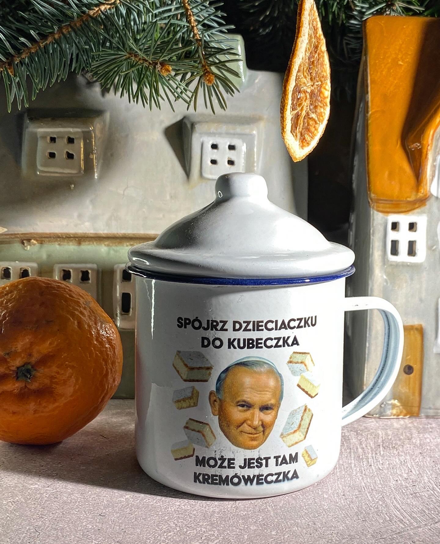 Kubek emaliowany z Ojcem Świentym z różnymi defekatami. A to część napisu niedostatecznie czarna, ale kolor kremówek i oblicza jak należy RZUŁTY. A to się tusz rozmazał, gdyż jak mówił Ojciec Świenty podczas spotkania z młodzieżą na Jasnej Górze w 1983 roku “Musicie od siebie wymagać, nawet gdyby inni od was nie wymagali”, lub trzy lata później w Lyonie “Nie mam srebra ani złota. Nie mam gotowych odpowiedzi na ważne pytania”. Dlatego nam też nie zawsze wychodzi.
